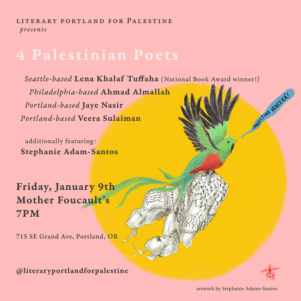 Back to All Events LITERARY PORTLAND FOR PALESTINE PRESENTS: 4 PALESTINIAN POETS Friday, January 9, 2026 7:00 PM 10:00 PM Mother Foucault's Bookshop 715 Southeast Grand Avenue Portland, OR, 97214 United States (map) Google Calendar ICS