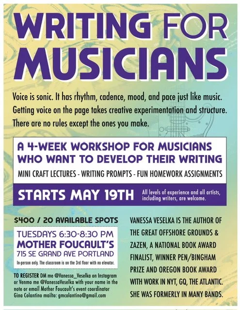 This is a workshop for musicians who want to explore or develop their writing. Our focus will be on exploring the sonic nature of narrative voice, particularly through sentence cadence, language intensity and mood, pace, and structure. The point of this class is to generate new work through experimentation and having some gritty fun.  Our time together will be a mix of mini craft lectures, discussion, writing prompts, and experience with homework assignments. While this workshop is designed for musicians, all artists are welcome, including those whose primary artform is writing.